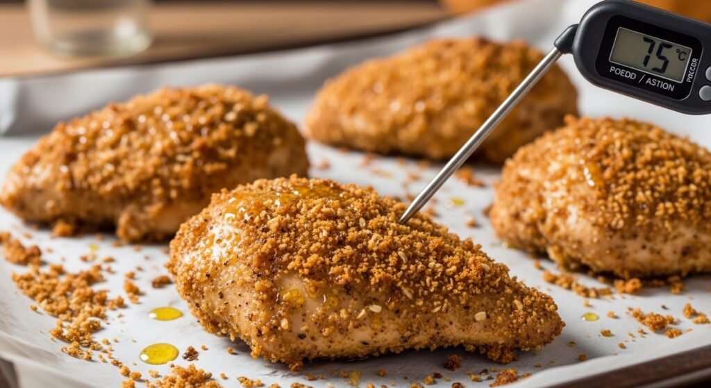 Deep frying increases the calories level through the absorption of oil. Seasoned whole grain crumbs applied to chicken and baked in a high temperature give the chicken a crispy outer coating. Browning is enhanced by a little spray of oil. Food safety should be at an internal temperature of 75 degrees Celsius.
